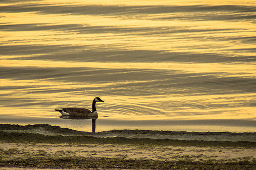 A lone Canada Goose meanders along the Lake Michigan shore in the glow of an early morning sunrise. Photo by Bill Pevlor.