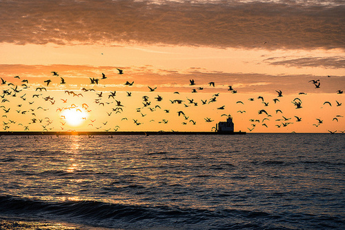 Seagulls take to flight before the Kewaunee, Wisconsin pier and lighthouse as the sun rises over Lake Michigan. Photography of Bill Pevlor.