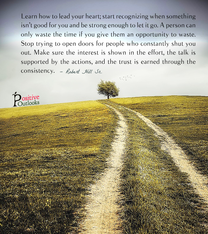 Learn how to lead your heart; start recognizing when something isn’t good for you and be strong enough to let it go. A person can only waste the time if you give them an opportunity to waste. Stop trying to open doors for people who constantly shut you out. Make sure the interest is shown in the effort, the talk is supported by the actions, and the trust is earned through the consistency. — Robert Hill Sr.