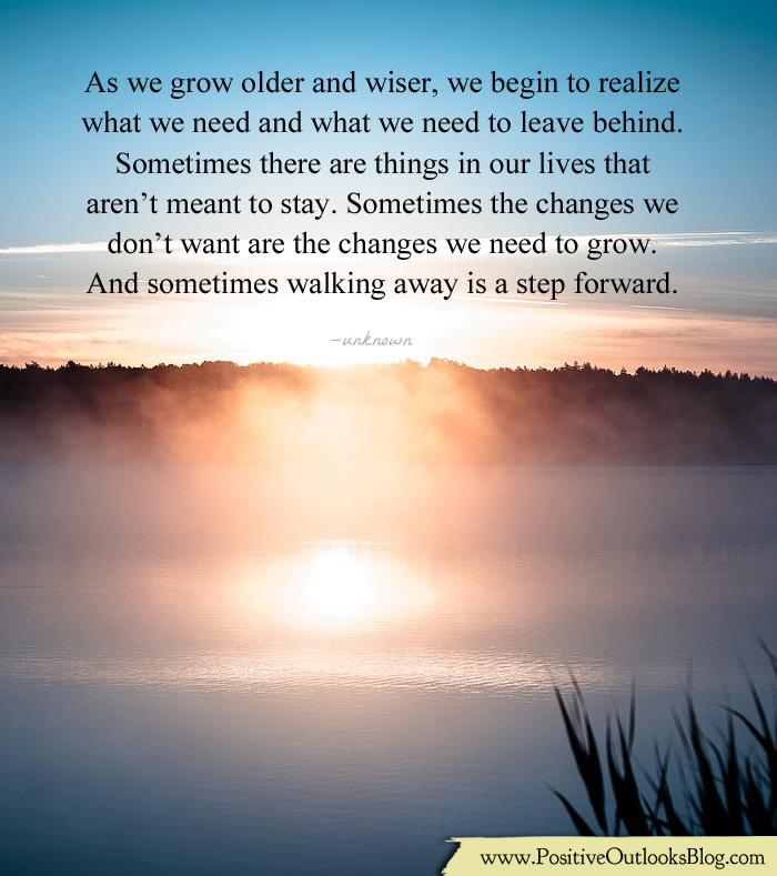 As we grow older and wiser, we begin to realize what we need and what we need to leave behind. Sometimes there are things in our lives that aren’t meant to stay. Sometimes the changes we don’t want are the changes we need to grow. And sometimes walking away is a step forward. — Unknown