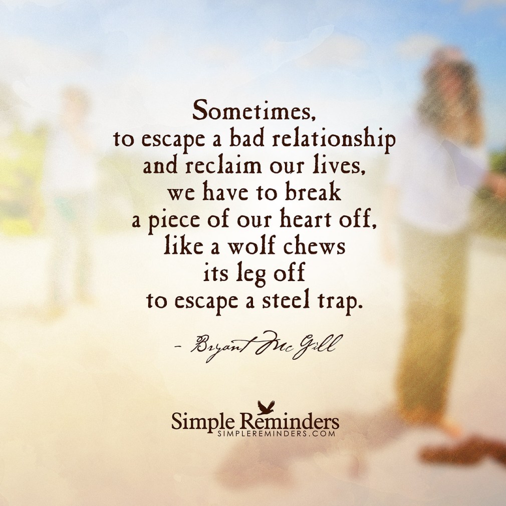 “Sometimes, to escape a bad relationship and reclaim our lives, we have to break a piece of our heart off, like a wolf chews its leg off to escape a steel trap.” — Bryant McGill