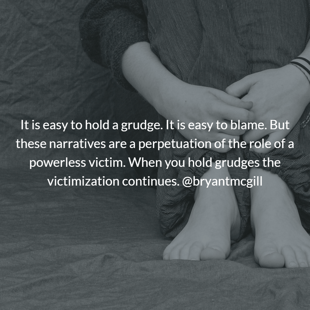 It is easy to hold a grudge. It is easy to blame. But these narratives are a perpetuation of the role of a powerless victim. When you hold grudges the victimization continues.