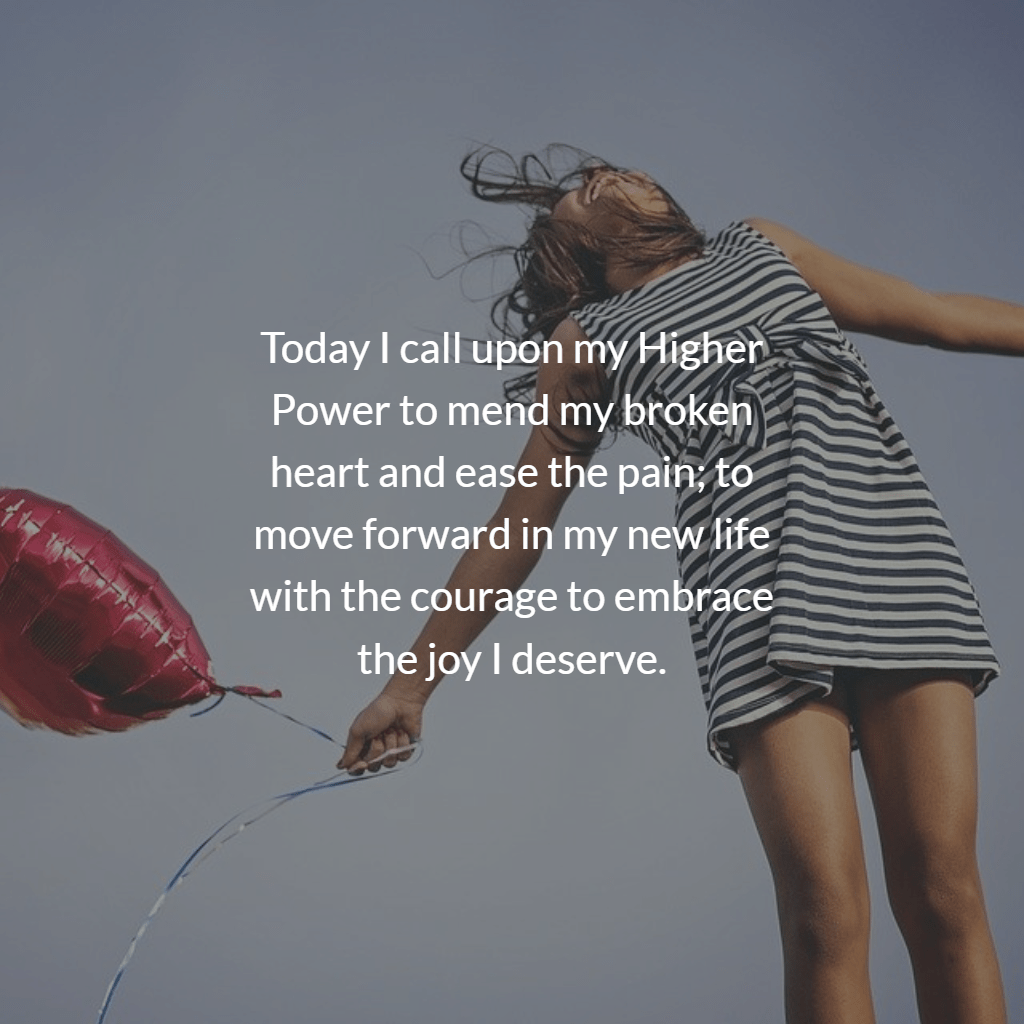 Today I call upon my Higher Power to mend my broken heart and ease the pain; to move forward in my new life with the courage to embrace the joy I deserve.