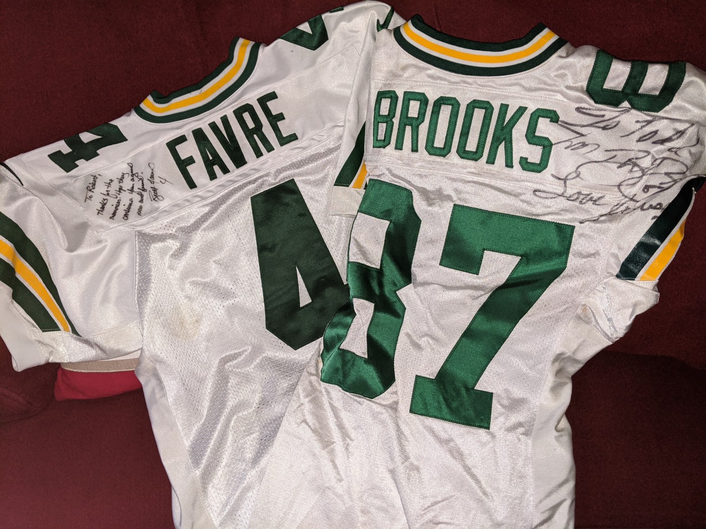 Years ago, I had the opportunity to meet Robert Brooks at his home and he gave me the autographed jersey Brett Favre had given him for his retirement as well as one of his jerseys with a dedication to me. These jerseys are now going to my son who is still a Packers fan way out in California…