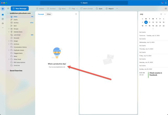 LOL. A week or two ago I reached out to the Outlook team at Microsoft via Twitter and let them know how much I hated the stupid message that said ‘you’re done for the day’ everytime I reach Inbox Zero (which is several times a day). Lo and behold the message is now changed…