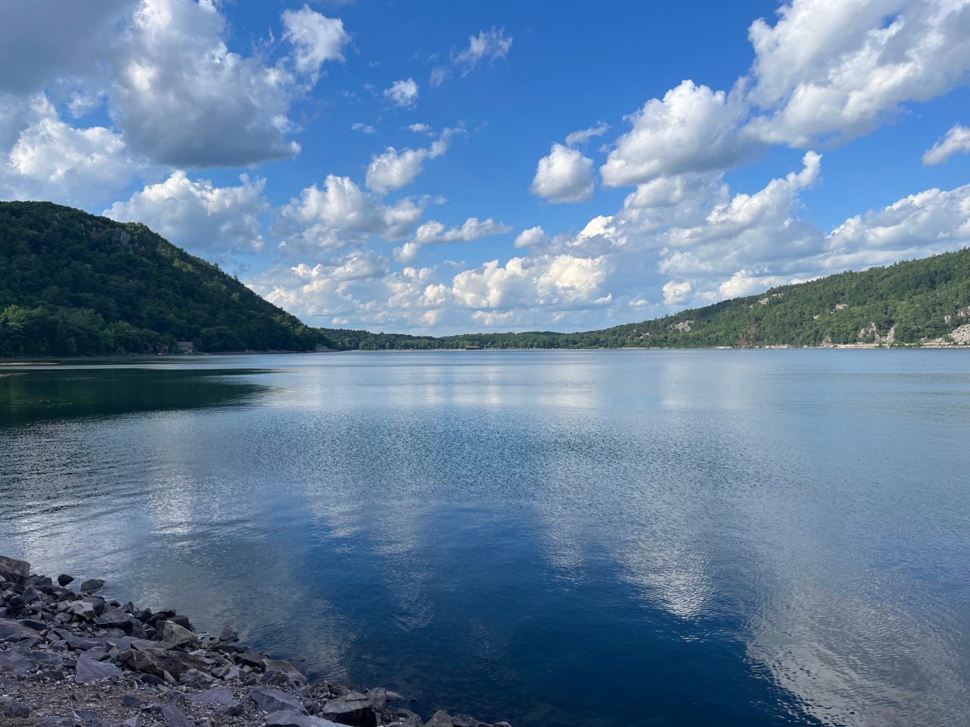 “Devil’s Lake State Park is a state park located in the Baraboo Range in eastern Sauk County, just south of Baraboo, Wisconsin. It is around thirty-five miles northwest of Madison, and is on the western edge of the last ice-sheet deposited during the Wisconsin glaciation.[2] The state park encompasses 9,217 acres (3,730 ha),[3] making it the largest in Wisconsin.[4] The state park is known for its 500-foot-high (150 m) quartzite bluffs along the 360-acre (150 ha) Devil’s Lake, which was created by a glacier depositing terminal moraines that plugged the north and south ends of the gap in the bluffs during the last ice age approximately 12,000 years ago. The sand at the bottom of Devil’s Lake is thought to be deposited by glaciers.