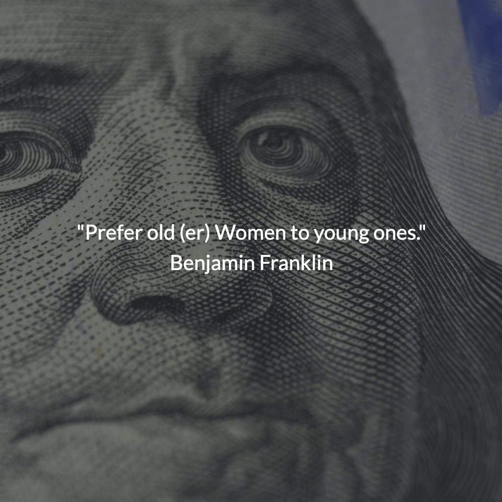 Ben Franklin is becoming popular once again. Did you know amongst the many pieces of wisdom he shared was the things he said about the benefits of ‘dating’ an older woman. Old Mistresses Apologue, 25 June 1745. Source: Founders Online: Old Mistresses Apologue, 25 June 1745
