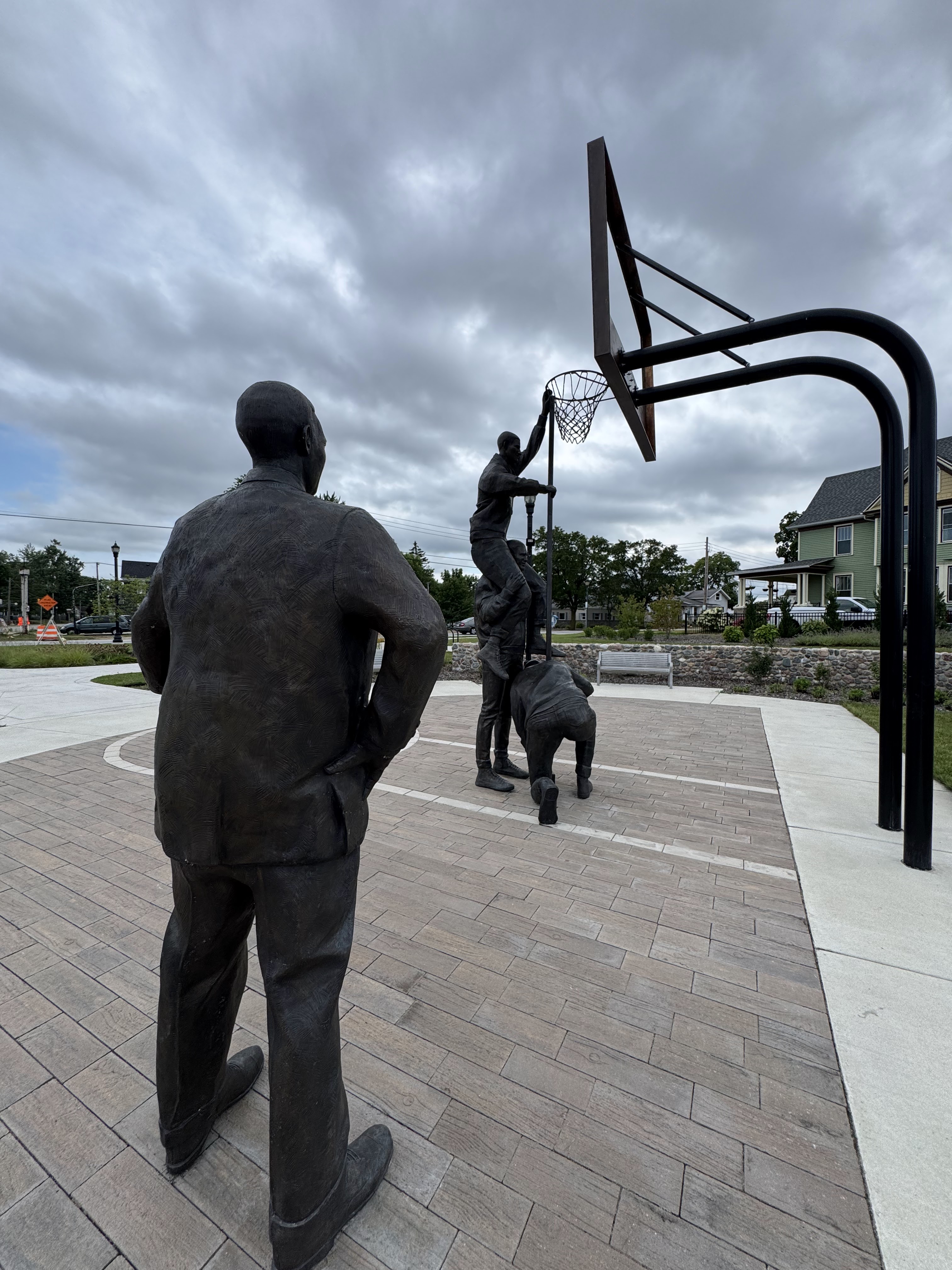 …meanwhile over in Elkhart there’s a lovely monument to Coach Dale immortalizing the moment when he had his players measure the net in the fieldhouse where the state championship game took place to prove to his players that even though the arena was bigger, the court was the same size!