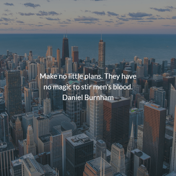 Great words from a great man. After the great Chicago fire in 1871, Daniel Burnham was the man with the vision that became the current city of Chicago. Read more about his life here. And make no little plans from this point forward…