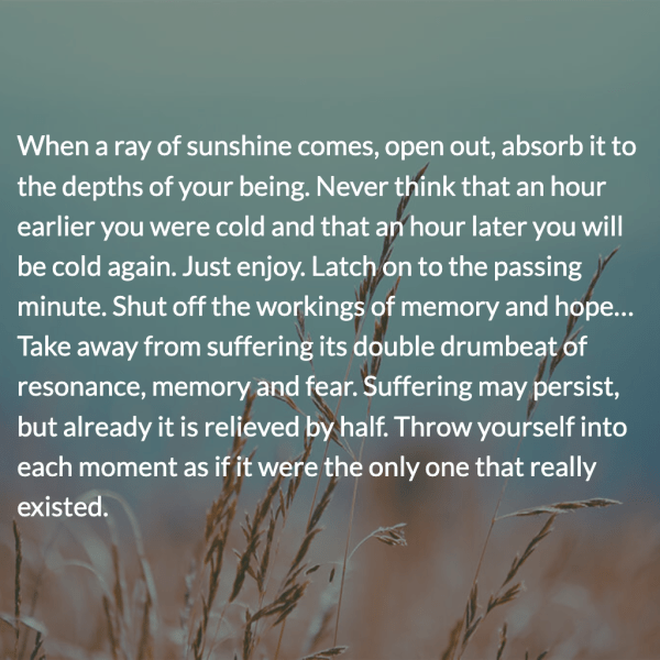 “When a ray of sunshine comes, open out, absorb it to the depths of your being. Never think that an hour earlier you were cold and that an hour later you will be cold again. Just enjoy. Latch on to the passing minute. Shut off the workings of memory and hope… Take away from suffering its double drumbeat of resonance, memory and fear. Suffering may persist, but already it is relieved by half. Throw yourself into each moment as if it were the only one that really existed.” Source: Just enjoy – Mindfulbalance