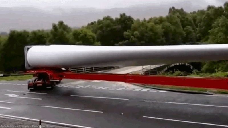 Those towering wind turbines that are slowly starting to cover countrysides around the world don’t just show up overnight—and they’re definitely not dropped in place by a helicopter. They arrive on trucks in pieces—staggeringly massive pieces—that test the skills of drivers navigating roads not designed to accommodate 200-foot long trailers. Source: Badass Trucker Nails the Gnarliest Right-Hand Turn You’ve Ever Seen