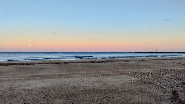 This morning as I was roaring down the highway heading to Planet Fitness, I looked over to my right and in an instant, I took in a wonderful sight: two swans swimming over a mirror-like pond with a full moon setting in the background. An image of a lifetime. I reacted too slowly to capture it though and in my mind I began to think over alternatives: I could backup along the side of the road, but it was too far. I could come back tomorrow morning, but I checked the weather and the forecast is overcast. Still, I drove on with full moon playing peekaboo behind buildings and trees beckoning for me to come closer. I decided to go for the next best thing at that point and I took a detour down to Silver Beach where I took these pictures. In between the time at the pond and the time it took to get to the beach, however, the moon was almost gone…