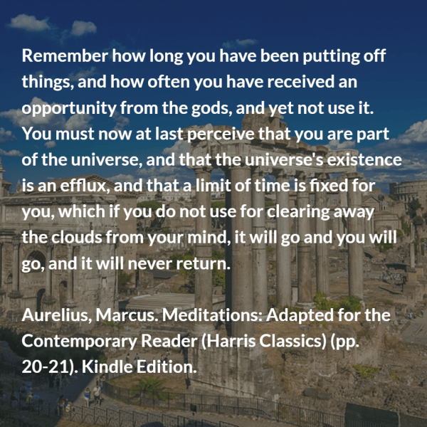Aurelius, Marcus. Meditations: Adapted for the Contemporary Reader (Harris Classics) (pp. 20-21). Kindle Edition.