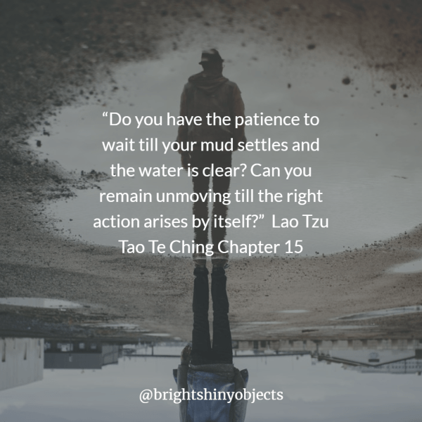 “While life brings you thrills and excitement, it also dispenses you with a fair share of puzzles and perplexity. You are perplexed when a good friend suddenly gives you a cold shoulder, worried when your boss speaks to you in a tone unusually stern, and anxious when your tour agent fails to pick you up in a foreign land. We tend to react when uncertainty arises; and often overreact. You can, as a matter of fact, try something quite different. When you are puzzled at what your see, do not stare hard. Instead, relax your mind and get your inner self to feel the thing. When you cannot figure out what you hear, do not struggle to listen. Rather, take a step back, and feel the vibration with a quiet mind. Let go of trying and open your mind to receive. When you allow your mind to receive, intricacy is given a chance to become simplicity; and the shapeless to palpable. It gets you see what you do not see and hear what you do not hear – moving you a step closer to reality. It brings the present back to you, enabling you to know what is actually happening. Do you have the patience to wait until your mud settles and the water is clear? “Do you have the patience to wait Till your mud settles and the water is clear? Can you remain unmoving Till the right action arises by itself?” Lao Tzu Tao Te Ching Chapter 15: Do you have the patience to wait till your mud settles – Tao Te Ching”