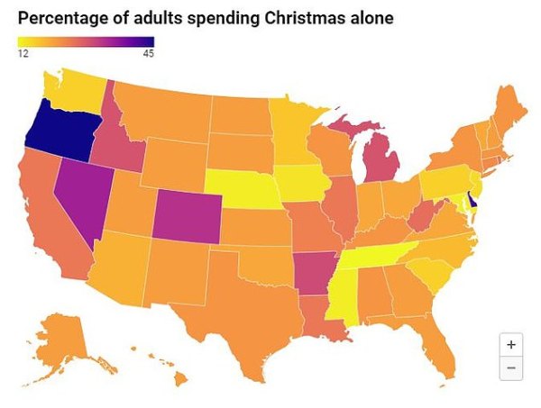 A new poll showed that around 19 million Americans are due to spend Christmas alone this year, which is one in 14 adults. Oregon has the highest rate of those celebrating alone – 45%. Source: Map shows how many Americans will spend Christmas alone in YOUR state