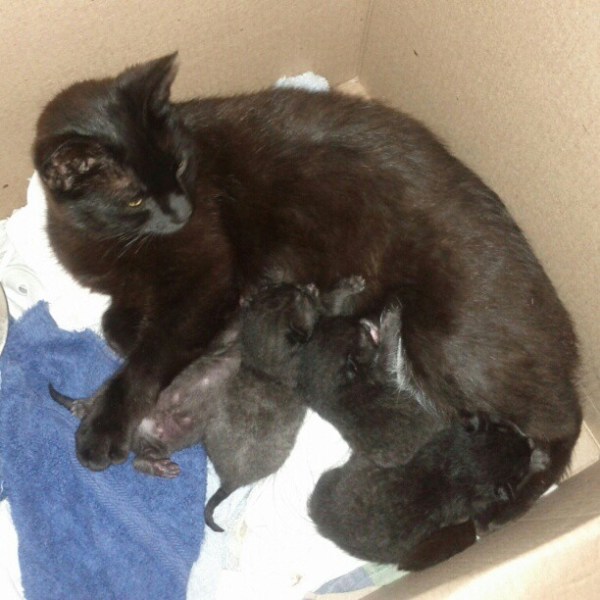 Boo has been keeping the babies in a nest up in the garage. Yesterday was the first day in a week she was OK with us handling them and relaxed enough to feed them outside, despite my son’s puppy…
