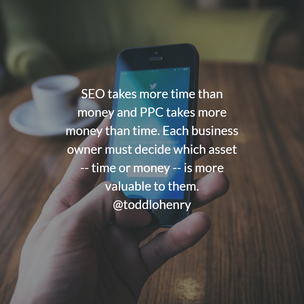 SEO takes more time than money and PPC takes more money than time. Each business owner must decide which asset — time or money — is more valuable to them and decide the appropriate mix. SEM takes longer to โkick inโ but longer to taper off while PPC starts immediately when you start paying and stops immediately when you stop paying.