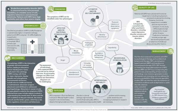 Patients with borderline personality disorder face severe stigma owing to the type and severity of symptoms. These symptoms include interpersonal instability, behavioural dysregulation and emotional dysregulation, and are the main focus of this PrimeView: Borderline personality disorder